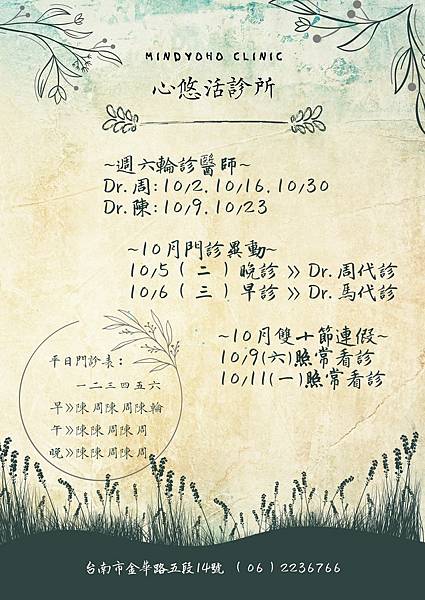 🇹🇼雙十節連假10/9(六)、10/11(一)照常看診喔!